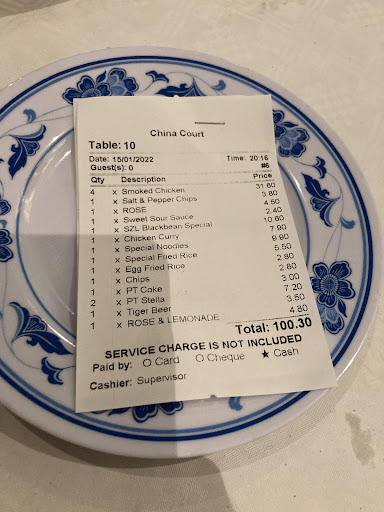 Read moreI took a resident from the care home I work at to this establishment. The opening times said 5pm. We arrived at 5 to minimise the noise of crowds due to the man's learning disability. The lady server (currently on the phone taking delivery orders) said we are closed until 530. We said no problem and drove around. We returned 535 and the lady looked surprised we had returned. Sat us down and stated "next time come at 6" we received the menus and I explained I will not be eating as I am a carer for this gentleman and it is his meal out. The main waitress looked at me like I had committed a crime and walked off. 15 minutes later the gentleman's food arrived, 5 minutes after we had still not received any cutlery, napkins or drink. I went up to the bar area to politely ask these items and she demanded me back to my table and she will get them. Once these items had arrived my client finished his meal. I went up to the bar area to pay and while handing over my money the waitress did not even look me in the eye, kept laughing and talking to her colleague in mandarin which was clearly about myself, handed my my change and walked off like I didn't exist. I thought this women must be discriminatory to people with learning difficulties but Looking at other reviews it appears this is a common trait of this female and she really is like this all the time. No one from my care facility will enter China court again and I will make sure every colleague, friend and person I speak to knows not to give a single penny to this establishment. The lady is clearly the owner/manager of...