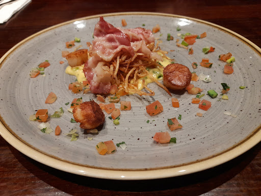 Scallops starter; fishy, dry and overcooked. The deep fried string onion bedding tasted old, cold and oddly chewy.