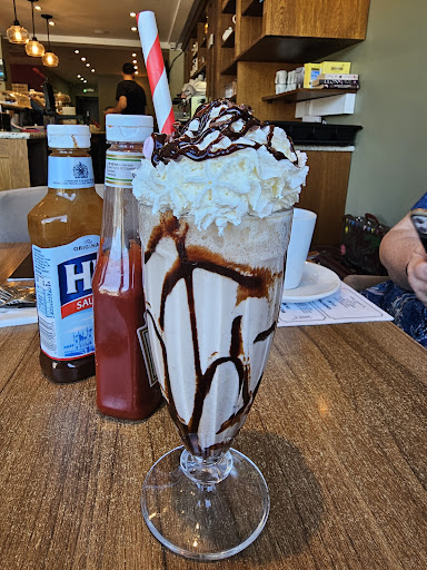 The food is quite average, I had a plate of watery nachos which was awful, but for the price, their breakfasts are ok. I've tried a few things there, and for the same price you could go to Starbucks, across the street, albeit with less choice, and have something a little nicer, or walk for another 15 mins and go to the gourmet queens kitchen, which is lovely. Their panini's leave a lot to be desired, their breakfasts burritos are quite bland but ok, full English was whetherspoons quality ish, cheap ingredients and you can tell. Their waffles and cakes are the only thing there I would eat there if I was pulled in there...