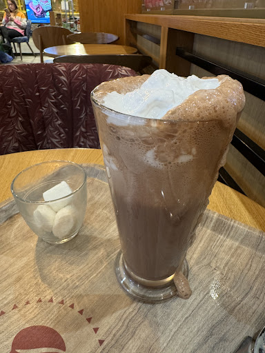 When our order was ready, the presentation of the hot chocolate was poor, with the cup barely half full and cream overflowing messily. I politely requested a replacement, but the second attempt was no better: again, half a cup of hot chocolate with an excessive amount of cream.