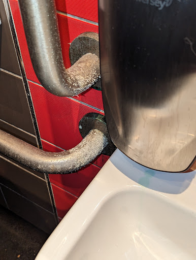 But after our food and drinks we went to the toilet (disabled in this case as my wife is in a wheelchair) and this is where the problems started, there were bits of biscuits on the floor and in the sink - now this a pity but hardly a game changer as the disabled toilet also serves as the baby changing room and a difficult child could easily have thrown a couple of biscuits around and they didn't seem to have been there very long. Unfortunately the hand grab rails were filthy, see photos, and looked to have not been cleaned for months - the floor being consistent with this view. At this point my review was going to be 2 stars.