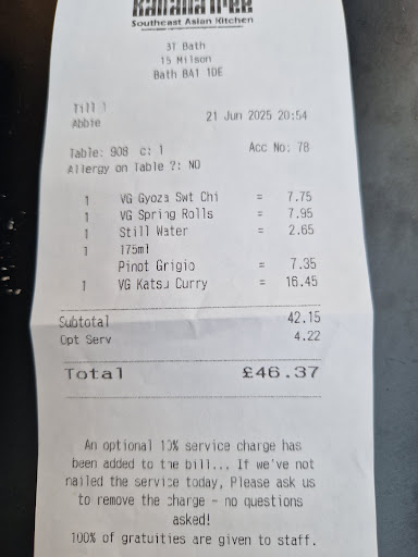Ā Ā Ā Read moreBanana Tree consistently serves delicious food with good value for money and I've always had excellent and enthusiastic servers at their other branches. This time I found the server very uncommunicative and a bit rude. Slim lady with a high blonde pony tail with reading glasses. When I walked into the restaurant, I approached the sign that says 'wait here to be seated', and she looked directly at me with a blank expression and didn't say a word. I had to ask can I just sit anywhere, and she said NO, I'll show you where you can sit. (Not welcoming at all !?) When I was done eating I tried to catch her attention 5 times to ask for the bill and I feel like she looked straight past me. I thought I'll try again after using the loos, and came back to my table and literally shot my hand up in the air a few times to catch her attention, and she again had a blank look on her face. Note that she was standing around doing nothing everytime I did this. Finally I had to walk up to their counter and out loud ask for the bill whenever SHE was ready (this is the server's job, not the customers'). When she came to my table with the bill, I had some confusion with the amounts but once she clarified that for me, she just stood around with the card reader clutched close to herself and not saying a word. I didn't know what to do and awkwardly reached over and made the contactless payment. Poor customer service by this lady which spoiled my experience, but the servers that day who actually brought my drink and food were very lovely and positive and that's why I will still visit this branch but hope that the service will be...