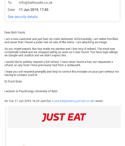 Not pleased with my experience of Bath Sushi. Attaching an email complaint below, also sent to the restaurant via their website, all to no response. Please beware of the potentially terrible hygiene standards of this restaurant (pubic hair in food - see attached photo), who also seem unwilling to apologise or even respond to any queries.