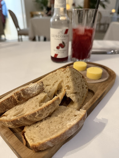 Our dining experience began with still water and a glass of the house red wine as we perused the menu. While we deliberated, we were treated to a complimentary piece of warm sourdough served with honey butter. This seemingly simple offering was a delight—the sourdough was fresh, soft, and perfectly paired with the subtly sweet and creamy butter.