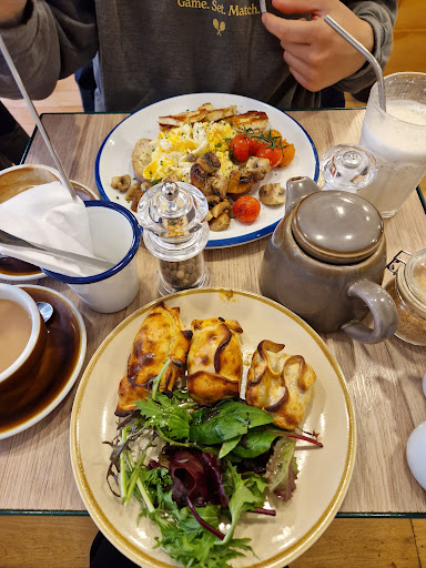 We were visiting Bath and searching for somewhere for brunch. This cute little cafe was highly rated and we were not dissapointed. Although very small and cosy with limited seating, we didn't have to wait long for a table (it quickly got quite busy after we sat down). The cafe is dog and family friendly and ideally located. Despite its popularity, service was smooth and timely and all staff were calm and friendly. My husband ordered the full breakfast (made vegetarian with haloumi) and I ordered 3 different veggie empanadas. Both were excellent and really tasty. Although I had slight food envy when I saw the avo on toast with poached eggs and pancakes with berries arrive at the table next to us (one for next time!). I had the masala tea which was lovely but the winner for me was the banana, oat and honey milkshake (it was so good my husband got one too).