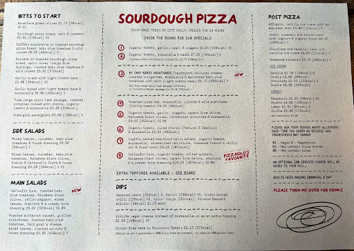 Read moreSat in on Saturday evening and ordered 3 pizzas, side salads, and lagers. The salads were unmixed, just a few plain leaves, a handful of olives, sundried tomatoes in mounds & the smallest dribble of dressing. Two of the marinara pizzas we ordered were missing the additional Stilton when they turned up, so the waiter took them back. When they returned 15 minutes later (online Deliveroo orders had clearly taken precedence on account of all the bikers with helmets on storming in and out of the restaurant), by which time my husband had finished eating his, there was barely any Stilton on them anyway so hardly worth sending them back, the tomato base had no flavour whatsoever, and the pizza was burnt completely on the underside so just tasted of carbon. We tried to liven it up with chilli oil but that had no heat to it either! This is so different from how it used to be, everything was full of flavour and joy to eat, but the food has really gone downhill. At the end of the meal the waiter hung round my husband’s shoulder waving the card machine so he felt too flustered to check the bill and only did so once he’d paid and the waiter had disappeared, to find that we’d been charged for the two replacement pizzas too. It took 25 minutes of the waiter going between us and his manager, who was lurking out the back, to try to issue a refund. In the end he told us that head office would be able to do it within 7 days….so who knows if that’ll happen! So if you want to sit in an empty restaurant with only Deliveroo drivers for company, get appalling service, eat grim pizzas and try to deal with a manager who doesn’t give a s*...