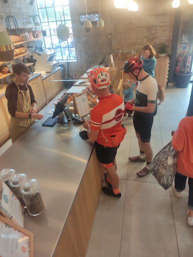 Great place for a coffee ofcourse, and a beautiful croissant to go with it. It was lovely to see them all being made in the bakery behind, very cool feature! However my only issue with this place was the girl with darkish reddish hair and glasses without a smile behind the till. I found her to be very miserable and rude and not interested in her job at all. I asked about nuts in the chocolate croissant as some people use Nutella, I didn't get a clear answer from her, just a 'i don't think so' well that's not good enough. This girl in particular needs retraining in customer service and maybe someone can show her how to smile. The face of the business is always the first person you see, and this lets down my experience. However, the rest of the lunch was...