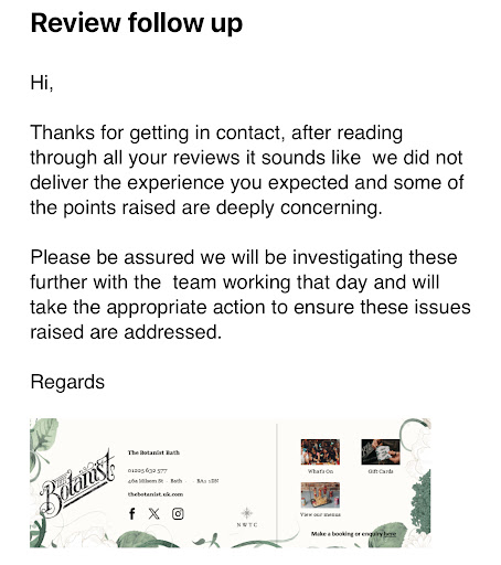 Read moreVisited The Botanist Bath for my birthday dinner on Saturday. I researched it ahead of time and the reviews sounded great, but it turned out to be one of the worst dining experiences Iâve ever had. Truly so comically bad that my husband and I just had to laugh about it, and go to Itsu to fill our bellies afterward.