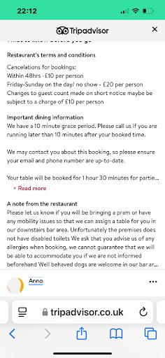 Read moreBeware of their very strict and misleading cancellation policy and be warned, they will keep your deposit regardless! Unfortunately I had to cancel a table the day before (I gave them more than 24 hours notice). Their cancellation policy says £10/person within 48 hrs or £20/person on the day or no show. I have sent them a photo of my phone log to prove I cancelled the day before ie. At the very most I should have been charged £10/person but they have taken £20/person and have refused to refund any of it. BE WARNED: They will enforce this policy without telling you. There will be no courtesy call or email to remind you of your reservation. And they will even take MORE money than is owed. Having called and taken this up with The Manager, when I asked for his name 3 times he replied, ‘I’m sorry I can’t hear you’ (even though he obviously could, because he replied)! Very surprising behaviour from a Michelin guide restaurant.