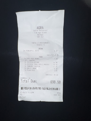 Read moreWe came here during our trip to Belfast searching for good Indian food, mind it keeping an Indian name doesn’t means its an India restaurant. The food was pathetic 0/5. We ordered Paneer butter masala, Nan & 2 Nonveg Dinner set. Each item was as equally bad as it could be. The Paneer butter masala was tasting like a sugar syrup. Even chicken tikka masala was tasting very sweet, which I was surprise to have. We left almost everything and tried finishing nan with their chutney which was still consumable. Would never recommend anyone. It took them more than an hour to serve while there was no one when we entered. The staff was friendly until we complained about the taste. Their behaviour suddenly changed once they got exposed.