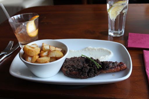 We ordered an appetizer of smoked salmon with beetroot mousse, rye bread, and gherkins. The mousse was really something special, but when you got a perfect bite with each item on the plate it was mouth watering.
