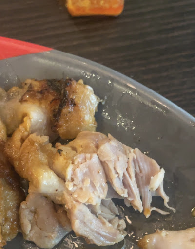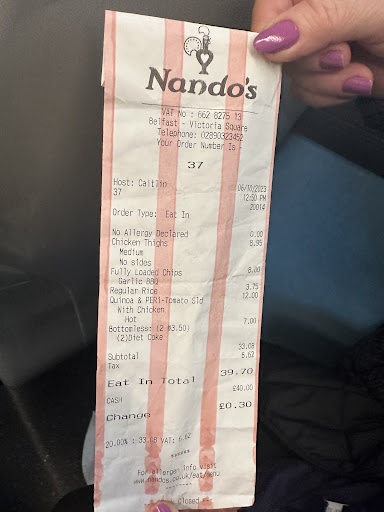 Read moreI do enjoy a Nando’s but this visit wasn’t the same as usual. My partner and I go to Nando’s once a fortnight and spend more money than we would like to admit. If I was to leave a review of all my other Nando’s visits it would be 5 Stars for sure. We went in and we were greeted as normal and asked if we have ever been before and seated. We both normally order drinks before placing our initial food order as we don’t really rush. Anyway, the starter of the houmous was amazing and is a normal go to for myself if I don’t order the halloumi sticks. But before we had even got onto our started our mains arrived which isn’t normal for any restaurant to do and definitely not normal four ourselves when visiting Nando’s. So we finished our starters and moved onto the mains. Chips weren’t as salted as usual and just tasted like frozen chips. The rice was extremely oily and hard in the middle. The garlic bread was tough and the worst bit, my chicken thigh was raw. I made a member of staff aware of this. She proceeded to tell me, a chef, that chicken thighs are meant to be pink. I understand that chicken thighs will not be the same colour as normal chicken but this was raw as you can see in the image that I have provided below. When I tried to tell her this she left us and said she’ll get the manager. The manager proceeded to have a discussion with her at the till for about 10-15 minutes so we decided to leave. No apologies, no financial reimbursement, no follow up email and a ruined evening. I am currently lying in bed with food poisoning and I plan on calling the health and hygiene agency for Northern Ireland with images of the chicken I got served. All I wanted and all anyone would have wanted would have been an apology and to get the chicken properly cooked. However, no one cared so measures will be taken against...