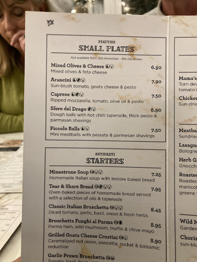 This does make you suspect the accuracy and reliability of the entire menu, we hadnāt ordered the small plate Picoloballs, meatballs, since my wife is vegetarian, but these can be made with or without gluten and had no G either, but what we did note was that the Picoloballs had a āVā indicating vegetarian suitable against the meatballs, really? vegetarian gluten free meatballs. Maybe the chef is amazing but then why was his aricini and dough balls not amazingly gluten free as claimed on the menu. Then there is the gelato, on a slightly older online menu ( undated but lower prices) I note the gelato had a milk symbol warning as well as a vegetarian suitable symbol, but the menu we were presented with in the restaurant had lost its milk/dairy symbol against the gelato. Are they claiming their gelato is now dairy free, or is their menu and dietary...
