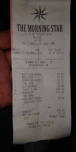 The first expereince was a while ago but we dining in restaurant for ‘Belfast restaurant week’ and i was horrified at the service. We arrived at about 20 mins to 7 and was promptly seated, then took 20 minutes to get staff attention to order despite several staff member walking past checking on table right beside us. After getting her attention at 7pm a Young blonde girl waitress then took our order, we waited over 45 minutes for starters to arrive and had to ask staff members twice to be give the excuse it was busy despite my partner going to toilet and noticing half the restaurant was empty and several members of staff just seemed to be walking about and that we could could kitchen staff laughing and joking beside being seating at the other side of the restaurant to the kitchen door. When starters arrived we were amazed at how it was small and simple starters soup and bread that was unbuttered and pork bites - ideally this is starter that would take no longer than 10 mins to prep and serve. A table nearby that was seated 30 mins after we arrived then received their starters promptly in comparison to us. After we had finished starters we sat a while with empty dishes before having to ask the same waitress could she clear our dishes rather than walk past us we said our mains would be shortly. Then Another 35 mins still no mains despite the restaurant getting quiet I asked the bar man for two drinks which he just left on a tray on the bar instead of bringing them to the table, after 10 minutes waiting for them to be served I just went up and lifted the tray to service myself to the table. After still waiting for our mains and getting ready to walk out and being ignored by several member of staff a staff member a oldish balding man told us our mains would be shortly 5 mins, this was despite the nearby table who seated 30 mins after ourselves receiving their mains of steaks before us, this made no sense. Our mains were basic burger arrived with no beer battered onion ring and was dry and tasteless very basic. My steak medium - well done, was definitely well done very grey and was I considered a cheap selection of steak similar to a buffet cooked steak with a lot of fat on it. After our mains we promptly decided despite ordered deserts we would cancel them and leave rather than waiting another 45 mins for them to come. On our bill we were still fully charged and no compensation. This experience ruined our evening, we thought being restaurant week we would have been impressed with the morning star, this is honestly the worse service I’ve ever seen from staff lacking basic incentive to no manager seeming to be in charge and customers receiving food despite arriving much after ourselves. I will most definitely be in touch with...