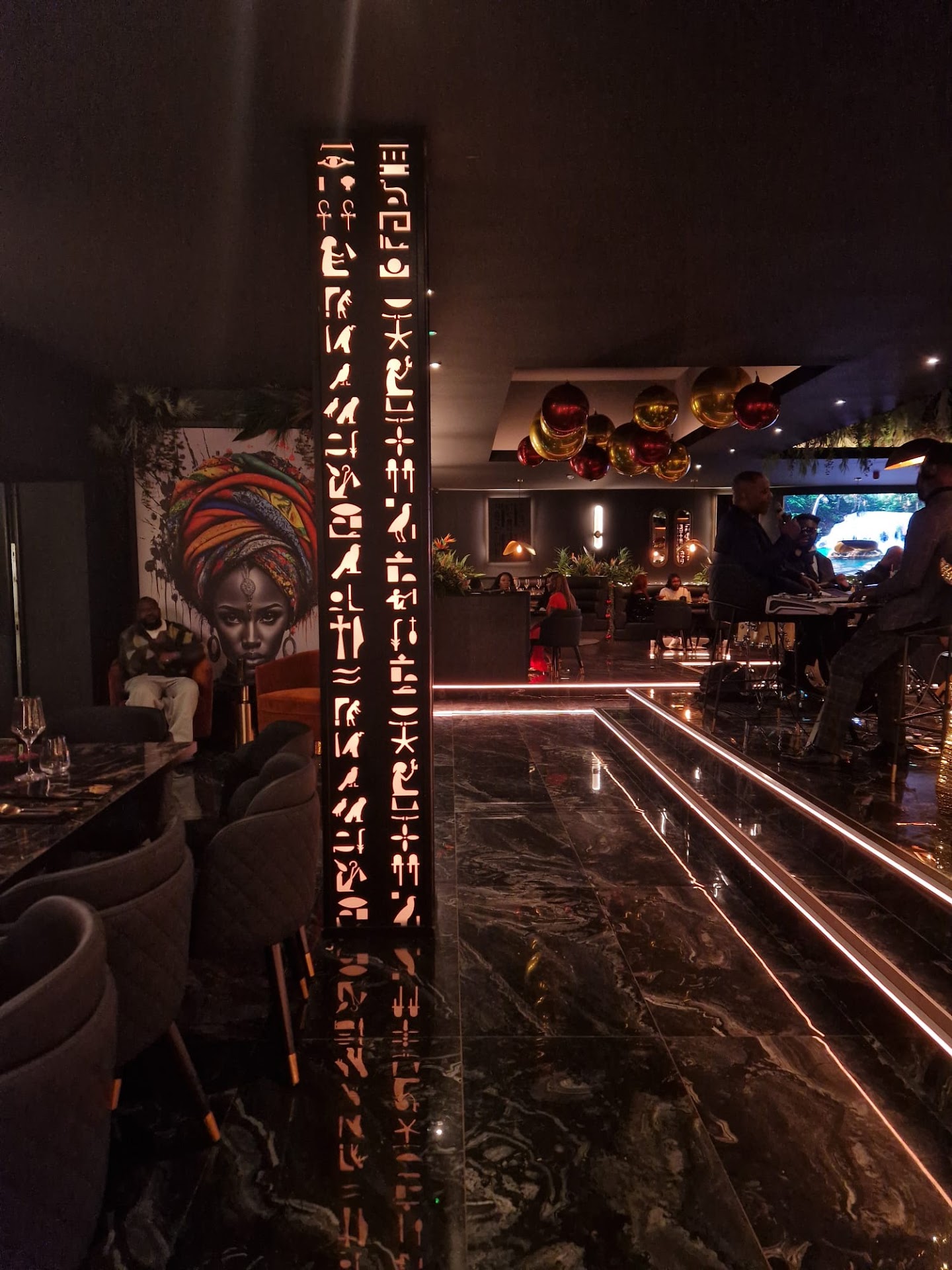 Ā Ā Ā Read moreThe restaurant is stunning, the decor is beautiful, it reminded me of tattu restaurant in Birmingham. So my expectations were extremely high. Also it being a brand new afro bar and lounge with such decor. I was really looking forward to it. But that's all I got, my expectations were greatly lowered the moment we stepped in. I came in with a large coat and no one offered to take it. We were shown to our seat and I noticed the staff were everywhere. All over the place, the restaurant was extremely loud I could barely hear my own thoughts, the music was amazing but wayyy too loud for a dine in restaurant. The bar area stunning. The male waiters looked amazing. I loved their uniform, the females on the other hand. I don't know what went wrong there. Dirty trainers and all black? Like why. Then, a man approached us getting our order, and I have dined in many restaurant and never have i ever experienced a waiter physically lean on the table with both hands writing down our order, and the guy couldn't hear us because the music was too loud and the people were way too loud, and he did not know the menu. I started to feel like i was in nandoes. The waitresses were all over the place, but none actually catered to us. At least in nandoes they come in to check in once or twice, we had to ask 3 times for tap water. The bathroom was stunning but had no running water I had to use the bar sink to wash my hands. The food was average, it looked nice but was very bland for afro cuisine. A restaurant like this should have extremely restricted dress code, some men came in with cut up jeans lower to their bottom showing their underwear, some came in with joggers, some with bomber jackets looking like gangster, it was disappointing to know they let them in, you will never be allowed to enter tattu dressed like that. The music was great but too loud, it's a restaurant not a club, I had to double check to make sure it wasn't listed as a club, the owner needs to train the staff in better customer service and you don't need so many staff lingering around. Also I understand it has a bar, but it needs to be controlled. People are standing all over it, lingering in groups it's actually disappointing to see and it ruins the aesthetic of the restaurant. Lastly the food was brought in using trolleys, it gave canteen vibes, who ever idea it was please, delete it, if there are too many food on a tray, do couple of rounds or get the lingering waitress standing around doing nothing to help serve the food. From simply looking at the restaurant it gave 5 star, eating inside its 1 star. I hope they take this as feedback and do better because I was going to bring my friends there but not...