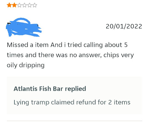 Read moreWas thinking of ordering from here until I read the just eat reviews. Regardless of if the food is good or not this place should be shut down for the way they treat their customers. The attitude is "We are the best and we cannot possibly make a mistake" and this somehow gives them the right to insult anyone who has any kind of issue with the food. They call everyone a tramp, nothing is ever their fault, they charge to correct mistakes that they have made. Absolutely unprofessional ridiculous behaviour. Also considering this is a fish and chip shop how is £20 minimum order and £4 minimum delivery fee with no option for collection even close to reasonable? £24 MINIMUM For fish and chips is absolutely crazy. And from what I hear the food is...