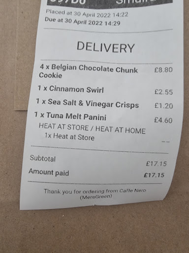 Read morewould give 0 stars if i could, ordered via uber eats will not be using again. Ordered 4 cookies which came to a price of £8.80 which 3 of them was frozen, ordered a cinnamon swirl and got a cold hard crossiant (which the person I rang to speak to tells me she added a not to bag) which she didn't as seen below. regards to the tuna melt panini, hardly any filling so u feel like u just eating the bread. order of over £21 for delivery home and not even nice enough to eat. will definitely be avoiding this shop, as I normally go to the sutton centre and they are good . p.s white shine on cookie where it is still frozen. came as a pack of 3 still frozen. when speaking to the so called manager was told to leave them out for a but and they will defrost. like are you kidding me? ...