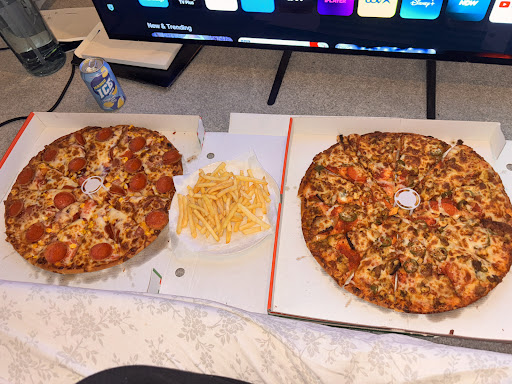 Pizza really fresh and fries are perfect. We shared a pizza meal deal which is an extra large pizza fries and a bottle of pop (1.5l). Pizza was fresh and perfectly cooked and fries stayed hot for so long they actually was hot long after the pizza had been eaten! There are 2 reasons that have lost this a star and that is 1. You can order pizza elsewhere and get dips for free these will charge and 2. They have prices advertised on widow but you get charged more and when you query it they say that their prices have just gone up! What? In the 2 seconds its taken you to walk from the door where advertised to the counter? Wow inflation...