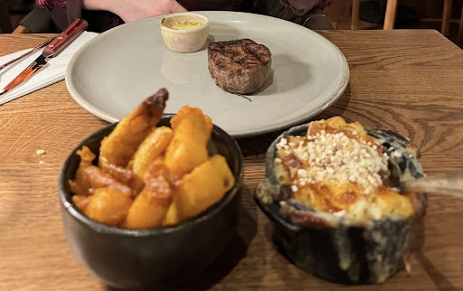When the main meal finally arrived, I was underwhelmed visually. The steak, while cooked too perfection, was served on a large plate with just a small pot of “split garlic” oil, resulting in the plate itself looking sparse. Sides were ordered separately, and while I understand this is common practice, the quality just wasn’t there. The “beef dripping” chips were cold and soggy, which was incredibly disappointing as a fan of beef dripping. Had they served the dripping as a separate dipping sauce rather than pre-soaking the chips, it would have been much better. The seasonal greens were also lackluster—I had expected tenderstem broccoli, but instead, I received regular broccoli. While this wasn’t necessarily bad, it felt underwhelming considering the price point and the restaurant’s reputation.
