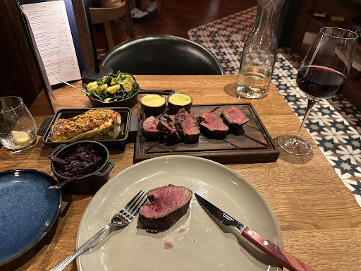 Both myself and my wife visited here at 5pm on a Wednesday. It was our first ever visit to a Cow & Sow. First impressions were good. It was clean, the staff were very welcoming and took our drinks order (bottle of red wine and a lager). For our starter we had the Cow & Sow sharer. This is a great starter for a couple of people...the pork rinds and burnt ends were superb although the whipped butter was still in it's very cold state if not completely frozen! Onto the mains; my wife ordered the sirloin (medium) with a cider and wholegrain mustard sauce and I ordered the ribeye (medium rare) with the beefy blue cheese sauce (out of this world). We also went for the cheesy leek gratin (beautiful) and the Koffmann's chips with dripping (you get charged extra for the sides and the dripping). Presentation was good but the steaks were cooked incorrectly (wife ended up with medium rare [that's how I wanted my steak cooked] and I ended up with medium [that'show my wife wanted her steak cooked]). However, spoke to Nicholas and he had my wife's whisked away to be redone without any fuss whatsoever. Unfortunately the chips and leeks weren't replenished when my wife's steak came back...again, no problem...Nicholas sorted that out and replenished the sides. However, when the new steak arrived back at the table (by the way she was fully prepared to have had the same steak just cooked a little more to the medium side as it was way too rare for her) it was even rarer than before so we just swapped our steaks. Kitchen- sort your s*&t out and read the actual order!!!!!! Maggie, our waitress definitely took the right order but the kitchen got it completely wrong! Anyway, the quality of the food was very good indeed and I had a great irish coffee to finish. However, and I'm annoyed that I have to say this but, with Pasture within touching distance, C&S are closer to Miller & Carter in terms of quality of steak than they are to Pasture. We both can't speak highly enough of Maggie and Nicholas who were attentive, charming and very kind. We'll give it a go again at some point. Cost for 2 people: £167.65 However Nicholas took my wife's steak off the bill and the additional sides making the total £126.75....what...