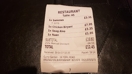 Read moreFairly typical Indian restaurant. We went late evening and the restaurant was practically empty, although there seemed to be a steady stream of people collecting takeaways. Nobody greeted us to begin with, but once we had entered into conversation with the staff, they were friendly. One of our party asked for one of the menus to be swapped, as it was wet, the replacement didn't arrive. The person serving the food didn't seem overly knowledgeable about what they had brought us - even though it was the same person who took the order - good job we could remember the names of the dishes we'd ordered! Aside from one of us taking a dislike to the ("tasteless") tomatoes, I don't recall any of us having any complaints about the taste of the food and the presentation was fine (once we had enough plates and cutlery between us).