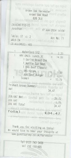 Look at the receipt, Harvester Arden Oak has charged us for one 3 course option £14.99 an orange squash £2.20 upgrades of chips £0.99 and an extra burger £2.50 a separate portion of scampi priced at £13.47 which was a final bill total of £34.47.