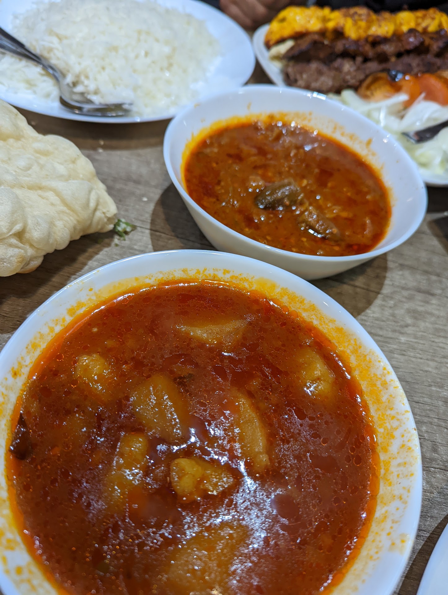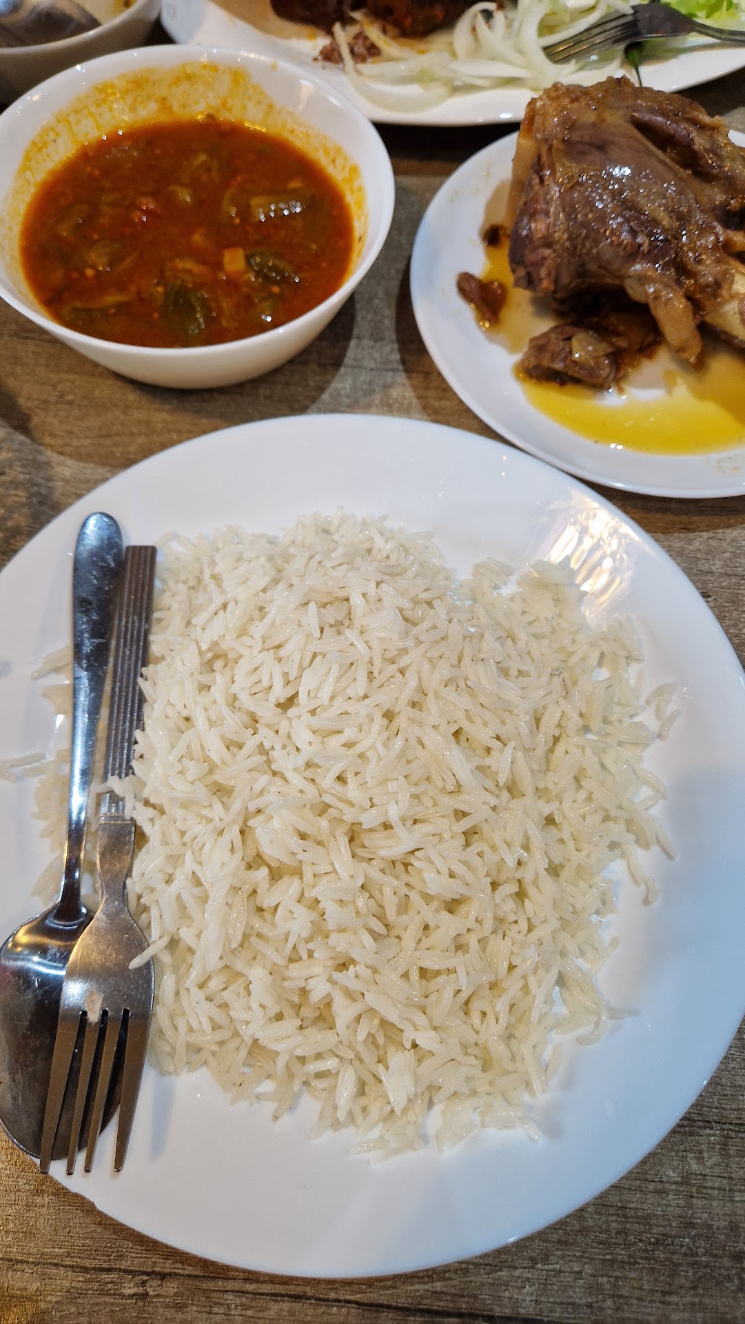 We arrived at 8.30PM and every item on the menu was sold out. The waitress recommended lamb qozi over rice as an alternative to the biryani (according to her it's identical). What we received was boiled lamb with boiled rice. Likewise the chicken qozi is boiled chicken over boiled rice. The potato and okra sides tasted identical - a tomato sauce that's dominated with oil and salt. The mixed grill plate - a skewer each of chicken, lamb and lamb mince kebab, all of which were tough, dry and salty. The naan where cold and rock hard, shatter like a poppadom.