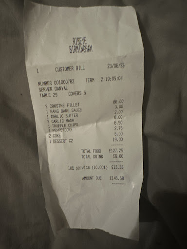 Read moreAs a fan of the Manchester ribeye I was so excited to hear that a sister branch had been opened in Birmingham and coincidentally a 5 minute walk from my place. I booked a table for me and my friend for 6pm . We walked down in anticipation and once we arrived thatâs where things went down hill, the hostess directs us to a table of two in between two other tables of both which were situated, we asked politely if we can sit on the end table of 2 as there were 3 free tables of 2, was asked as the tables were quite close and we wanted some privacy. The hostess said she needed to ask her manager and left us standing in the middle of the restaurant for 5 minutes with staff coming up to us asking if weâre okay, it was extremely uncomfortable. The hostess said those 3 tables of 2 were booked for a party of 6 and will be pushed together. We sat down in between two other situated tables. We were so close we could hear their conversations. When you go out to have a nice meal you want privacy not a random stranger on your lap. We ordered drinks and the wrong ones were given, not a great start at all. We ordered our food and before it came, to our shock the same hostess sat a party of 2 in the table we requested, there was no party of 6. We were lied too, lying to customers blatantly in their face is an example of horrendous customer service, we definitely knew there was no table of 6 as two other people were then sat on another table we requested. The saving grace was the food the, steak was cooked to perfection, cut through it like butter, the portion sizes were smaller than the Manchester branch we did notice. The dessert, the chocolate mouse with crĂšme brĂ»lĂ©e insert, was absolutely beautiful I really enjoyed the texture and creaminess of the dessert. Another piece of advice is do not have your staff standing in one place in a group of 7 just staring at the customers, itâs very intimidating. Also allocating one person to a table would help as we had 6/7 different staff members approach us. The food was lovely however the customer service let it down, i will not be returning, & I hope improvements are made for your sake.we also had an additional item on the bill that we didnât receive, again that shows the incompetence of the staff memebers. Also an automatic service charge was the cherry on top, the cheek of charging us for an absolute incompetent experience, all down to poor...