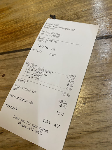 When we asked for the bill, it was brought, we paid by card and the bill was taken away again. I have a credit card receipt but no idea what it's for. The numbers do not add up to what we expected. Appx 10% more.. perhaps there was a mandatory service charge or as others have said the prices charged are somewhat flexible or advising the website not up to date. Hard to argue when there is no menu card. (Yes we could have check the receipt in detail or asked for a receipt copy but don't normally expect this sort of thing - perhaps we are naive and it is prominent, we were visiting and don't eat out in Birmingham very often.)