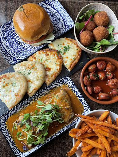 We ordered: 🍔 Iberian Burger 🐟 Cod and Pepper Croquettes 🇪🇸Spanish Chorizo 🍗 Garlic Chicken Thighs 🍟 Sweet Potato Fries 🧄 Garlic Flatbread with cheese