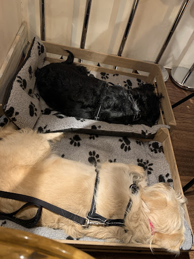 Have since returned and pleased to see the place buzzing at 2pm on a Thursday. Thought we'd struggle to get a table having not reserved, and as we were accompanied by our 2 x 11 month old labradoodles, but the staff offered us a larger table (54) without any quibble. A bit of feng shui with the furniture & the two dog beds supplied by Willow and we all settled down for a couple of hours dining (& wining). Garlic mushroom (stuffed with mascarpone) starters followed by 1 x double steak burger and 1 x halloumi and courgette skewer main courses tasted as good as they looked. Bottle of house red was equally enjoyable. As for the dogs.....they enjoyed a couple treats and...