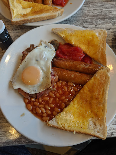 2nd visit to this place, as i am working locally, The food is overpriced and average to say the least. After ordering a small vegetarian breakfast cappuccino and carrot cake, I received my coffee and breakfast, So ate my breakfast still no cake, i tried to speak to one of the staff at the same time as my workmate as he hadn't received his chips either, The woman then walked off without speaking to me. Then i caught the attention of another one of the staff, I told her that i hadn't received my cake yet to which she replied, Why do use lot have to be so rude! (I guess by us lot she meant working men we are a team of bricklayers.) Then followed up with i didn't serve you, To which i replied what difference does that make, She then stormed off banged about collected a cake from the fridge crouched down on the floor with the cake. Then brought it to me slammed it on the table and said sorry about the delay. Never seen anything like it, the staff were noisy, rude and had about a 60 IQ between the lot of them! I shall not be returning! *star for the...