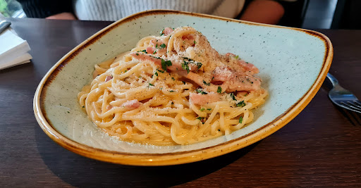 Food arrived fast and was really nice!! 😋.. Didn't order anything flash or overly fancy, just a classic simple carbonara with some focaccia bread, oils / balsamic.. Was rely rely good!! Wolfed the lot!! 🤤🤤🤤.. the bread was warm and fresh with a good balance of Rosmary & sea salt. The Carbonara was rich and creamy and well balanced 🍝 .. Complemented with a Crisp glass white wine, I could happily of sat there all afternoon getting pissed 😆!!...