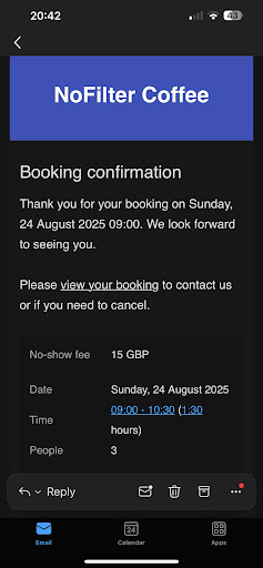 Unfortunately would not recommend. We had booked a table here for 9:00am on a Sunday morning. We arrived at 8:50am and said to the waitress we had booked a table for 9am, to which she replied “okay?” and looked at us all blankly as if we’d just ordered a chicken tikka masala in a Chinese restaurant. We then asked if we should just sit anywhere (because the waitress didn’t fancy telling us what was going on), and she replied “yeah just sit anywhere, I’ve not had chance to look at the bookings yet, and we don’t open till 9am”. which was fair enough as we were early but the shop was open. As we were there, customers started coming and going with coffees so I thought they must be serving now so I’ll go up to the counter. I was told to sit down outside and my order will be taken in 5 minutes. It got to 9:15am, we had been there 25 minutes and 5 people had been in and ordered coffees from the counter and had all been served all before anyone came to see us, but we were told we had to wait at our table to order anything. Finally the rude waitress came to take our order and I explained it was a bit annoying we were the first customers there and we were the 6th customer to actually have their order taken. The waitress couldn’t care less and explained she was on her own and the coffee machine stopped working (but could make 5 other orders before ours, after I was told I couldn’t order at the counter and had to wait at the table).