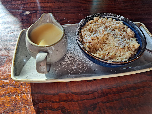 Limited choice of starters. Only 3 to choose from. I went with the Calamari and Prawn with Sausage and Mash for my mains and Crumble for dessert. My brother opted to select off the main menu and went with the ribeye Steak at £18.50 with peppercorn sauce at £2.00. I have to say I wasn’t impressed. The calamari was tasteless as was the Tartare Sauce that came with it. The 3 prawns had some flavour but I felt this starter had come straight from the freezer to the microwave. Mains again a disappointment. The sausages had a nice texture but the onion overpowered any other flavours. Mash was nice. And my dessert was again quite bland. Little flavour to it. So all in all I was disappointed.