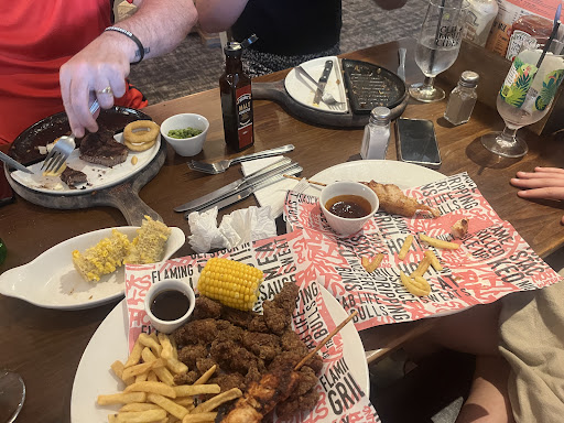 We ended up ordering at the bar because the app wasn’t working properly as phone service was very slow. Even after clearly spelling out our order, what we got was baffling. Only 2 out of 4 meals were right. The other two? Practically the same order—both the chick & mix with two sweetcorns, fries, and chicken skewers—but one with strips and the other with boneless wings and added garlic bread. Should’ve been simple. Instead, both meals came out after the others had already been served, completely wrong, and then were taken back to the kitchen. One plate eventually came back out, mostly correct, but still only one.