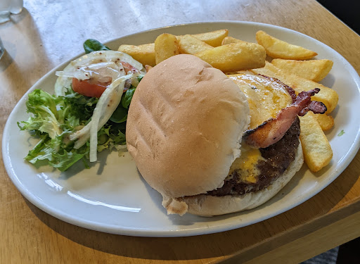 Went Friday around one pm to meet up with a friend. Place was busy and only a few tables spare. The seated area is accessible for people with disability and mobility problems but is a ways from the car park. You make your choice from the menu, get your table number then go to the counter to order and pay. This section is not accessible for the disabled as it has a number of steps up to it. I didn’t notice any other way up. There were a lovely selection of cakes on display in this area as well which looked very tempting. A wide range of condiments in sachets available on the dining area floor. I ordered the burger with added cheese and bacon with a bottle of sparkling water. My friend had prawns with baked potato and a latte. Even though they were busy it didn’t seem to take long before our food was brought over to is. This was good as my friend was on her lunch break. Burger was good. Bacon was tasty but I am not a big fan of cheese like this on a burger. Although I do love cheese I prefer the processed cheese slice on a burger. It was a bit overpowering for me and if I had again I would order without. The chips appeared to be fresh and home made not frozen. One or two could have done with a little more frying. Plus it wasn’t the biggest of portions. However, these are minor quibbles. I would be happy to dine there again. The menu has a nice variety of options from hot and cold sandwiches, jacket potatoes and main meals. Not forgetting the cakes up near the till. Prices for me seemed very competitive. My burger with added cheese and bacon and a drink was a little over £10. The number of people dining there suggests they are doing...
