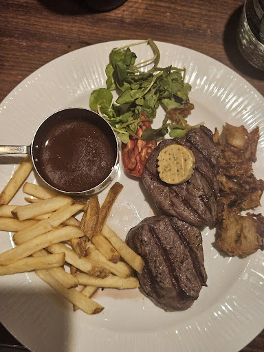 Really great experience. Firstly, Arnie (host/manager), was extremely friendly, warm and welcoming. While being shown to the table engaged in a small casual conversation. The decor and atmosphere in the restaurant was perfect. Soft background music to relax their guests while the staff were moving in between tables taking orders or engaging with their guests. It is clearly evident they are very well trained. My waitress was Jubilee who was equally warm and friendly. She allowed me some time to go through the menu with every item being described perfectly. It was difficult to choose. I went with the calamari to start and 16oz ribeye as my main. Now onto the food. Calamari was delivered shortly after ordering. And it was honestly the best calamari I've had in years. Perfectly coated and cooked. Lemon and garlic aioli was paired with which was a great condiment. The calamari didn't last long. Once the plate was removed in less than 10 minutes, my ribeye was brought out. Cooked 100% medium rare (the only way to enjoy a steak) with three peppercorn sauce and fries. Promptly took my photo and dove straight it. Fries cooked properly and well seasoned. Added some peppercorn sauce to them. But the steak was the main act. Again, perfectly seasoned and cooked. Every bite was blissful. Ribeye will always be my favorite cut and the chefs proved why.