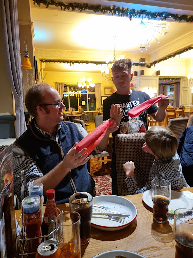 The pub was clean, well decorated, very festive. We loved the doggie options. The staff were friendly and helpful when approached. As we were due to leave, a staff member very kindly told us we could use the side door to exit, a quicker option facing straight to the cars. The main door was a longer route and the rain (storm gerrit) was coming down in buckets sideways! It was very much appreciated.
