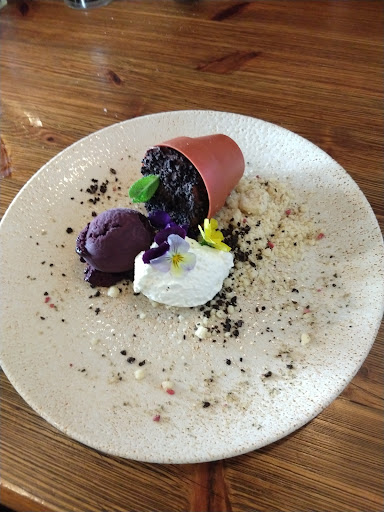 Read moreOk so about the fourth time we have eaten here .... Everyone makes mistakes and it's about how you recover the mistake. . 3 drinks ordered 2 out if the 3 were wrong but it was sorted no quibble.... Starters camembert wedges ... The cheese was on the plate under the empty breadcrumb shells ...but tasted ok ... Prawn and mango cocktail was great only suggestion sometimes more is less .... Way too much lettuce...pate was nice but needed more butter casing to use... Mains 8oz sirloin faultless ... Medium exactly as requested ... Kedgeree fishcakes needed more sauce as they were a little dry but size was spot on poached eggs are terrible To do at the best of times but it was ok now .... The belly pork ....3 lots of crackling in total all like rubber bands first pork like a bullet really hard and dry so the was sent back a round of drinks were provided whilst we waited a fresh pork.... Much much better and piping hot ...now Desserts.... Waited 25 is minutes and a very apologetic man said the order has been missed and offered another round of drinks caramel biscuit torte very powdery filling possible a supplier fault just not whipped enough..but other than that tastes ok... Orange blossom creme brulé cracked exactly as it should though it stated biscuits there were a couple of not so nice bendy cookie drops I think they were ....the the masterpiece in the picture ... Black forest in a flower pot .... An edible chocolate flower pot of some of the best sorbet I've tasted ...fantastic ... All in all an ok meal but had much much better there ... All...