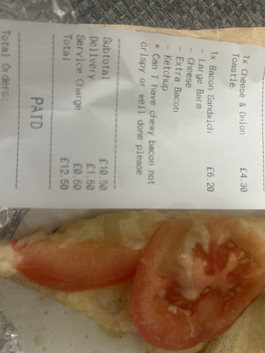Read moreOrdered twice in the past 2 weeks, asked for no crispy or well done bacon but both times they did well done. Then got a large barm and ordered extra bacon and came with three pieces, does that mean a large would be two pieces and a regular would be one piece of bacon? Then got a cheese and onion toastie, came with cheese and tomato. I mean it’s 2 ingredients to get right. Ordered from here hundreds of times but will not be...