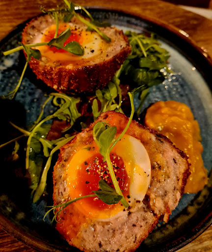 Tonight we opted for three courses of gastro delight. We both had the scotch egg to begin, accompanied with the endless dish of firm, juicy olives. The scotch egg itself was delicately seasoned with a delicious fondant egg. Alongside was the homemade piccalilli.