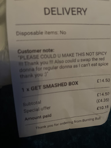 Read moreReally disappointed with the service, I ordered the food and they'd got the orders mixed up, I ordered the chicken wings, 1 burger and 3 portions of chips, when I got the wrong Order I rang up and was told that I should put the wrong order aside and that they would prepare my food again, so an hour later the driver arrived and I checked my order and they had only deliveried the wings and I was told quite rudely to have the chips from the Order before even though I'd left it aside as I was told and they had gone hard and cold, I had waited 1 hour and half for my food to arrive and when it did half the order arrived warm and half the order cold from before. Really unorganised, and was put off from ordering from...