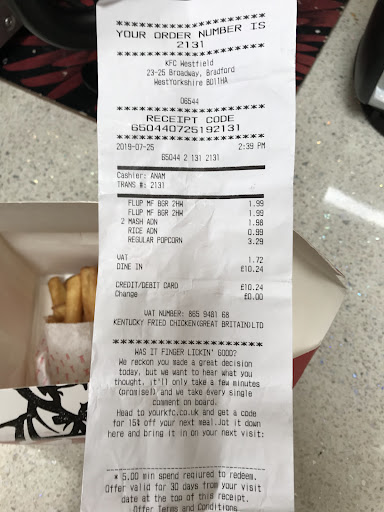 Read moreHi people There - KFC in Broadway Bradford shopping Centre. I give it 2 Stars. The two stars are not for Hygiene or anything. The 2 stars that I gave is for the service that they give you sometimes. Couple of days ago I got the Fill up box. Which you get inside you get. You can google this. inside the box you get one. mini fillet and 2 hot wings and chips. This for £1.99. This offer is before 3-AM.So I picked up my food two boxes of fill up box.And by the time I got home it was about 4:30pm. I checked in Both boxes and the hot wings were missing. And they charge me £1.99. For this. What sometimes the service has been lacking. But apart from that. The...