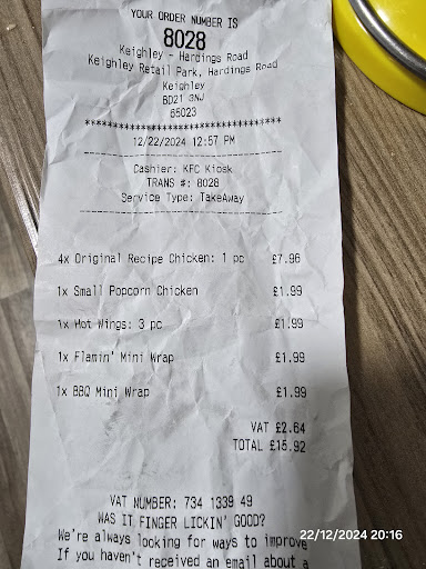 Read moreNever have seen such a KFC outlet anywhere. Here in Keighley KFC we are getting cheated we pay for 1.99 pounds for one piece of Chicken but in return we are been fooled. Ordered 4 piece of Chicken on its own paying around 1.99 each but in return this people cheat us giving 2 actual pieces and another 2 waste piece which is absolutely cheating. We ordered 4 pieces so that 4 people can eat well but on seeing the parcel we where shocked. Just 2 actual pieces and the other 2 some waste left out piece fried and adjusted that to an whooping amount of around 8 pounds. This is not the way to deal with customers in Keighley. Hope the management understands this. What if I have ordered each one one order then we would have got the correct exact chicken piece. Very pathetic experience I hope no one gets cheated like this anymore. Please be cautious regarding this, specially to the innocent ones who are getting cheated. Buy the end of the day every penny counts not the business and the management like this specially only in Keighley which I have come across. Hope things would be corrected. Many times I recieved the order like this I was quiet but today am very upset since every penny is a hard earned money. Hope the management realises this and takes steps to stop this sort...