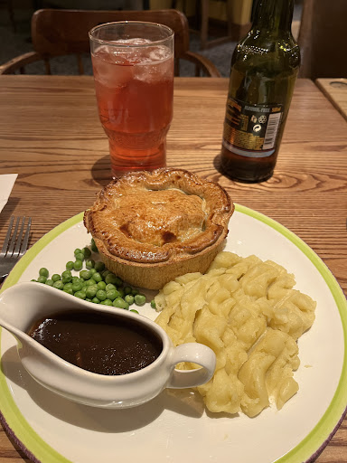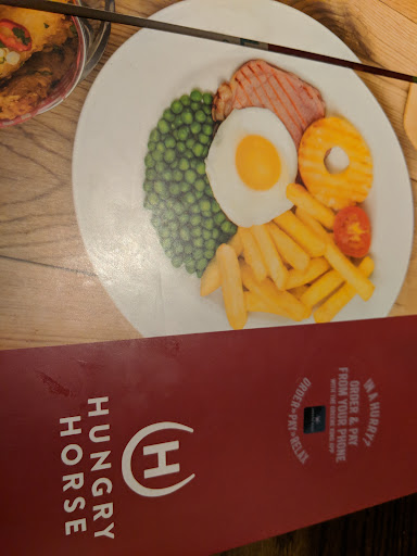 Read morePopped into here after a few hours at the discovery centre. Was expecting it to be busy. No it wasn't. Was informed that they had had a fire in kitchen a few days before so limited menu. No problem with us. We had a small dog with us so sat in the bar area. (Party of 4 adults to children ooo and not forgetting the small dog). Hubby and son ordered drinks and the bar and daughter in law was given printed out menu. Grandaughter ordered of kids menu and the rest of us of normal menu. After a bit of confusion at till with a young chap getting stressed. He walk of and spoke to the chef coming back and just asking anything else. Son and daughter in law had the vegan mushroom pie with mash potatoes peas and gravey. Hubby had the chicken tikka curry and I had the chicken tandoori on the hot plate. Well the mash hard, the gravey cold. The Only thing that warmed it was cutting the pins and letting the steam out. Hubby's curry had hardly any chicken and as for my dish the veg was stuck to the hot plate and would even say half a chicken breast on plate. However we were all starving after 2 hours at the discovery centre we would have eaten anything and I think we did. OK we thought maybe dessert will be better. Hummmm I had the horseshoe doughnut.......very very sticky. Didn't eat the top off it. Hubby and Granddaughter had the mini brownie. Again very sweet overly warmed and hard. Granddaughter didn't eat hers at all. Son and daughter in law shared the crumble. Custard was like water. I always thought that a hungry horse was one step up from a weatherproons but now I think they are a few steps down. Only went because it was on way home. In future will avoid the place. Staff weren't much better as spent more time chatting at bar...but with limited customs what else did they have to do...
