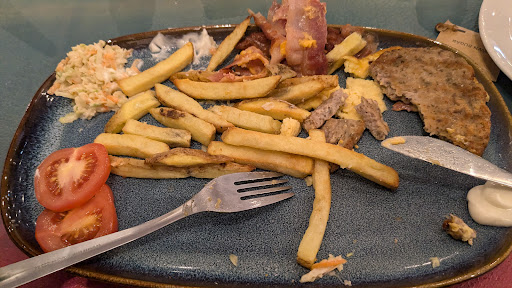 Ordered a cheeseburger and an Americano £13.50. couldn't have a bap as NO gluten free option available, not for sandwiches or anything!! Food was appalling- burger appeared to be mainly veg, v thin so there were two - and oddly curled at the edges, so obviously reheated in a microwave and dried out. There was an odd omelette between the burgers , processed cheese and exceptionally over crisp bacon. Obviously microwaved. The burger tasted disgusting, the chips were black in places( as if they were frosted or damaged before being cooked), they tasted of stale fat and were oddly greasy, but had been microwaved. There was no salad as mentioned in the menu and was told by an extremely surly male that the bare dessert spoonful of coleslaw,was infact the salad! No coleslaw is a pickled condiment. Salad consists of lettuce, cucumber, spring onion, rocket, etc.The male was rude and asked me to leave as I had been promised a 50% bill reduction on the food. I had been given £3.50. The meal was £10, and coffee was £ 3.50. I tried to point this out and was told I had abused his staff! There was only one other couple in and they were having coffee only, this was at 12.30 pm, middle of lunchtime when other places close by all v busy. Coffee ok, but think this was packet coffee as there was no smell of freshly made coffee and no coffee machines in use and it seemed to be gritty as if made up from a powder. The two female staff were friendly and as helpful as they could be but the male was surly and insulted me - a female on my own. I still have my receipt( I requested it from the card machine). I would not recommend, needless to say the...