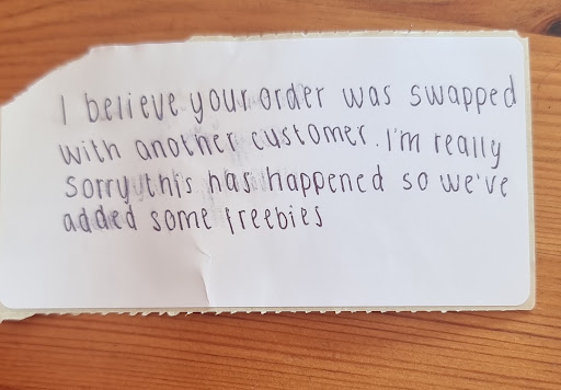 I often order online a lot and today I was given the complete wrong delivery. I got a quick refund, ordered again and this time when the food arrived they left a note apologising for the mixup and added some freebies in (and good quality freebies too)