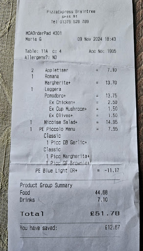 Read moreI suppose we all know Pizza Express, as it's in most towns and cities in the UK. Been to one, been to them all...well not quite. Experiences and expectations differ depending upon various factors, such as food quality, location, management, staffing, service, date and time of visit, etc. This branch of Pizza Express is very well placed, right by Essex's Braintree Freeport Village Outlet, which attracts a lot of visitors and customers, especially in the run-up to the festive season.