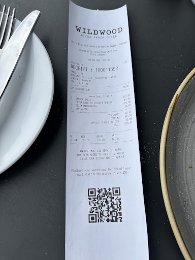 Read moreThis is our second visit to Wildwood and I'm sure not the last. Conveniently located alongside the shops at this outlet we were seated promptly and service was spot on. Pricing is appropriate throughout the menu across food and drink. My meal was a buttermilk chicken burger and a side of fries, the chicken was deliciously moist and the bun nicely toasted, I was offered cheese and bacon but for me this is a burger that stands well on its own and this one certainly did. The side of fries were good, skin on , salted and rosemary seasoned and we shared these amongst us, Sparkling mineral water to drink. My Daughter had a margherita pizza which looked excellant- nice and thin , cooked well and she certainly finished the plate which is saying something as she does not have a large appetite and the portion size was generous. My wife had a light option spaghetti bolognaise with salad- opting for no dressing although this was offered. My wife has a very small appetite currently and did not finish the plate , but this is no reflection on her enjoyment of the meal and the restaurant. Service charge (optional) was added to the bill - in this case it was...